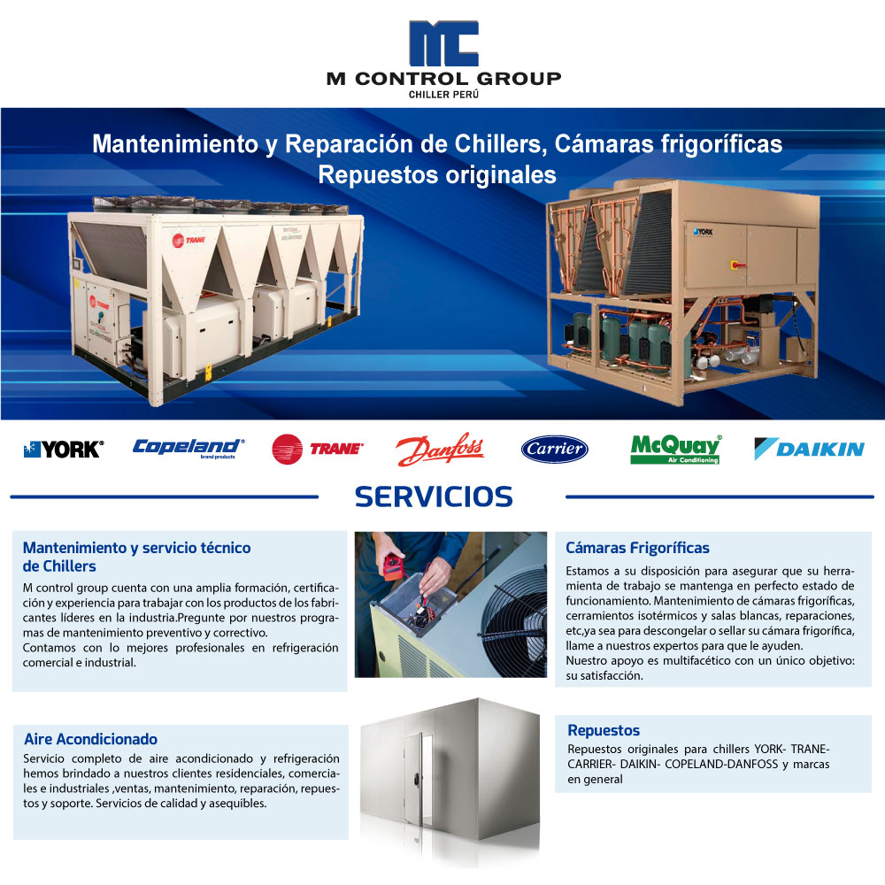 En M Control Group, somos expertos en todo lo relacionado con equipos chiller, incluyendo la venta de repuestos para todas las marcas. Nuestra amplia variedad de repuestos garantiza una solución rápida y efectiva a tus necesidades de reparación y mantenimiento. No importa la marca de tu equipo, tenemos lo que necesitas para mantenerlo en óptimas condiciones. ¡Contáctanos hoy mismo y descubre cómo podemos ayudarte!